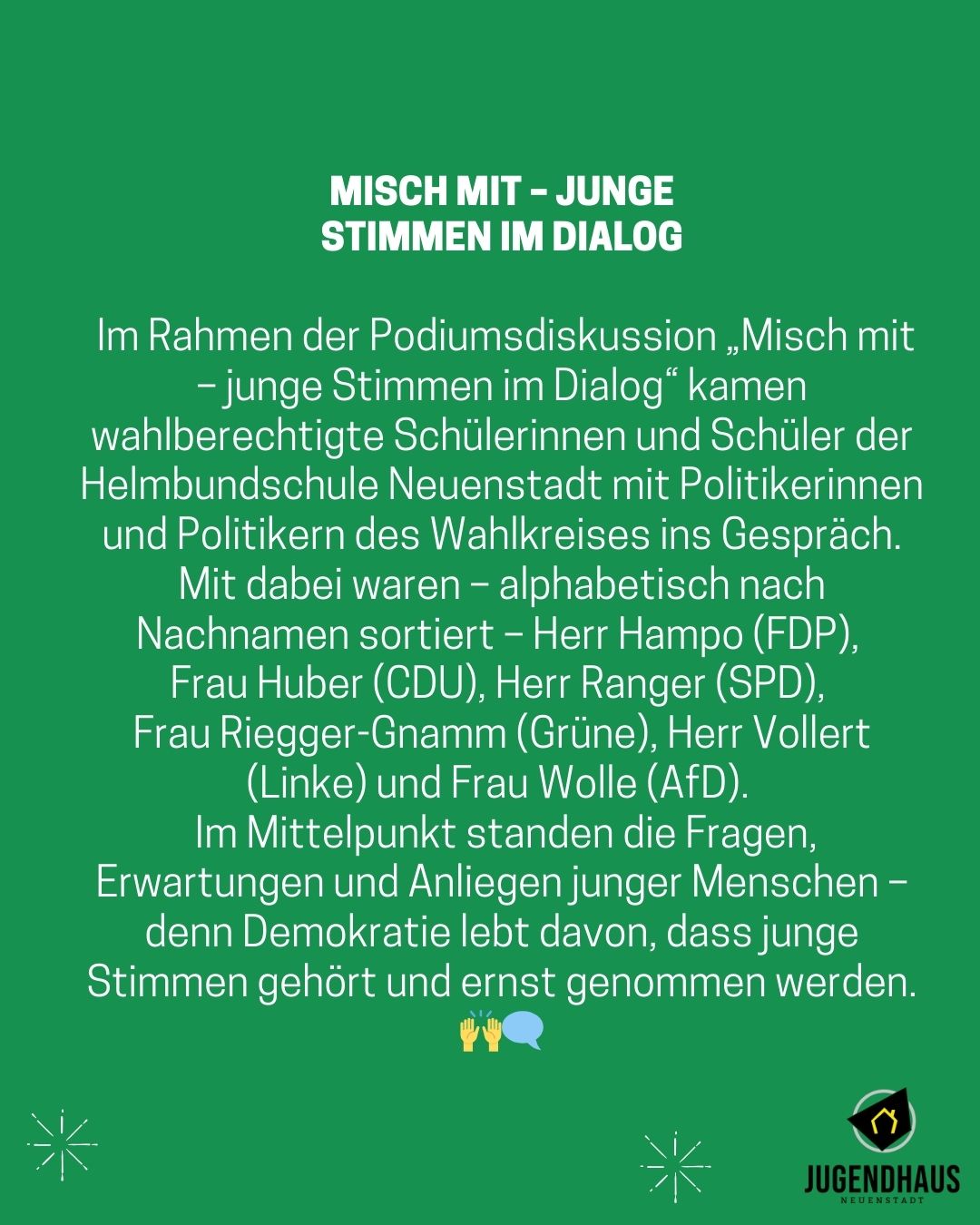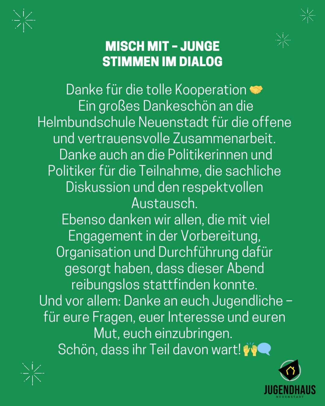 Ein herzlicher Dank gilt den Sponsoren und Unterstützern, ohne die das Fest in dieser Form nicht möglich gewesen wäre: Der Gottlob Dietz GmbH, der Firma Förch, dem Kreisjugendreferat Heilbronn sowie Edeka Ueltzhöfer. Ebenso ein großes Dankeschön geht an den Bürgermeister Andreas Konrad für seinen Besuch, Martin Trunk vom Jugendförderverein Brückedächle für die Abholung des Cocktailwagens, den Stadt-Kreis-Jugendring Heilbronn für den Cocktailwagen, den Jugendförderverein Brückedächle und an Marion Gulden und Larissa Sattler, Mitarbeiterinnen der ev. Jugendhilfe Friedenshort, für die Unterstützung.